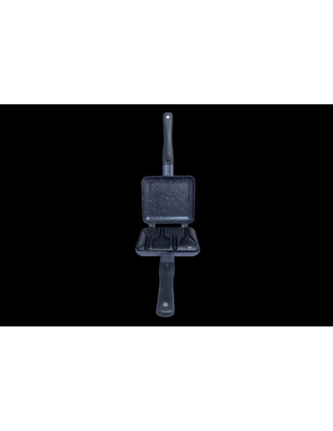RidgeMonkey Connect Sandwich Toaster Granite Edition cuenta con manijas desmontables de tacto frío, un sistema de bisagras desmontables que transforma una sartén en dos y un juego completo de utensilios que cabe dentro de la tostadora, junto con las manijas, para un fácil almacenamiento. La forma cuadrada también significa que se desperdicia menos espacio de almacenamiento que con los utensilios de cocina tradicionales con forma circular.