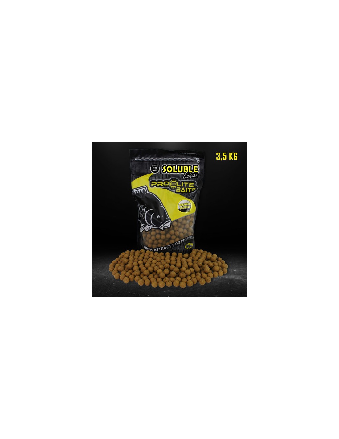 Boilies solubles en formato de 3,5 kg, elaborados con una mezcla premium de harinas, proteínas y atrayentes naturales que se disuelven progresivamente en el agua, liberando una potente nube de aromas y estimulando la alimentación de las carpas de manera rápida y efectiva.